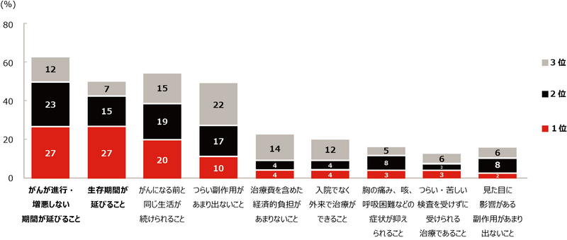 1位で最も多かったのは「がんが進行・増悪しない期間が延びること」と「生存期間が延びること」でいずれも27%でした。