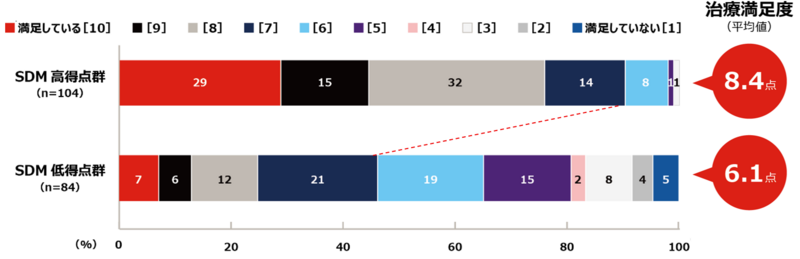 治療満足度は、SDM高得点群が低得点群に比べて有意に高く、平均値はそれぞれ8.4点と6.1点でした。