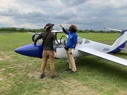 【グライダー搭乗の様子(左)、滑走路近くでワークを行う様子(右)】