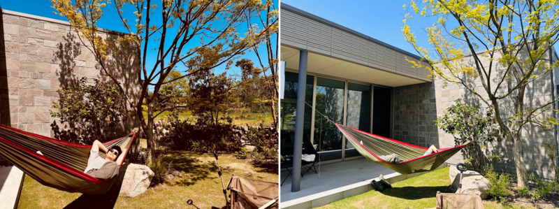 さらに、「出来上がってみると、石積みが思った以上にかっこよく、とても気に入っています。また、ハンモックを掛けられる立派な樹木が欲しかったので山下さんと一緒に、木の畑まで一緒に見に行き選びました。アオダモと、幹の太いヤマモミジの木陰でゆったりと過ごせ、自然の中でくつろげるようになりました。」と話してくださいました。