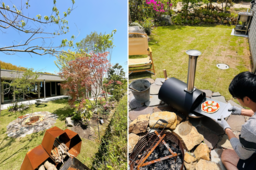 ファイヤーピットでお子様のDくんを抱いてバーベキューの準備をするK様(右)