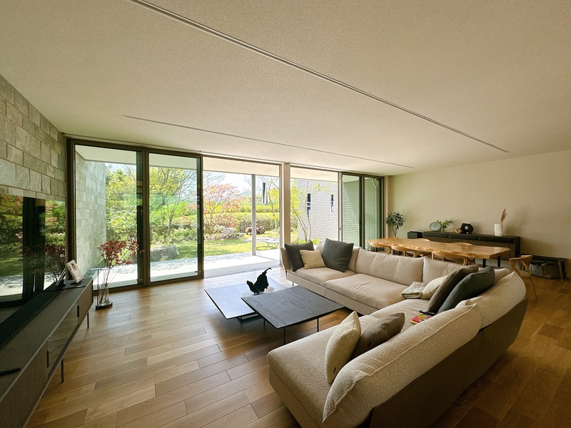 さらに工夫したポイントは、室内にいながらも自然とのつながりを感じられる点です。リビングから続くフルフラットのタイルテラスを採用し、芝生の庭と室内との視覚的・感覚的な一体感を生み出しました。段差を少なくすることで、自然と庭に出たくなるような動線が生まれ、タイルテラスからもスムーズに外へ出られるようにしました。リビングと庭がつながることで、暮らしの中に四季の彩りが溶け込むような空間ができました。