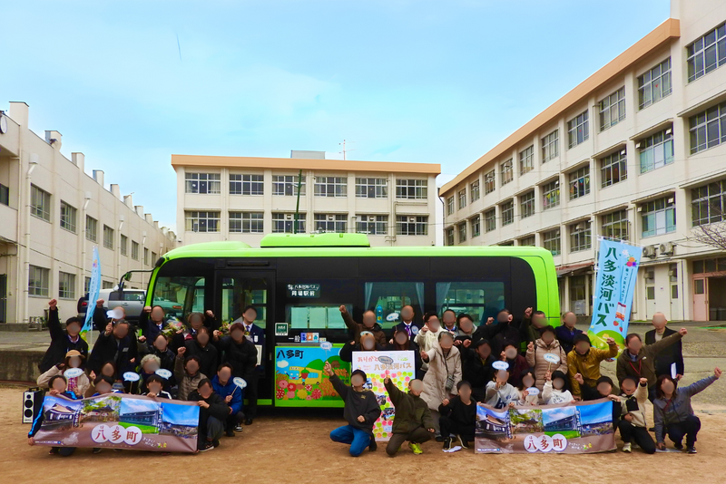 八多淡河エリアに義務教育学校八多学園の児童らが監修した「お絵描きラッピングバス」が運行。