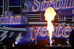 「 DROP IN」「VERSE」などを披露したKMNZの後、前半を締めくくったのは、謎に包まれた大型新人「JYuno(ユノ)」。キャラクターデザインは、人気イラストレーターの村カルキが手がけており、事前にはそのビジュアルだけが発表されていた。ビジョンに「JYuno PROJECT」と映し出され、「傷ついた心が、光に変わる瞬間を。私は生きている、この瞬間に。この痛みも、この涙も、すべてが音になる。国境を越えて、音楽で私と世界は繋がる。そして、これが私の始まり」というメッセージが打ちし出され、「私の名前はJYuno」と名乗ると、それまでのステージセットが消え、ビジョンには全く違った世界観のイメージが映し出された。暗闇の中を光の粒子が舞い、それが人の形になり、「The ONE」を歌唱。日本語と英語を交えたメッセージ性の強い歌詞とクールなサウンドは強烈なインパクトを与えた。炎の特効の演出もあり、期待値が高まる中、楽曲の後半、ついにその姿が明らかになった。ヴァーチャルな光の粒子の姿だけでなく、リアルでも登場。顔はハッキリと見せることはなかったが、“JYuno”という存在を観客にしっかりと示すことに成功したと言える。