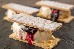 サクサクのパイにハスカップソースをまとったレアチーズムースをサンド。雪国北海道をイメージしたデザートです。