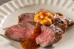 牛サーロインステーキにうにを重ねた、和風ロッシーニ仕立て。お好みのソースやわさびで、お召し上がりください。