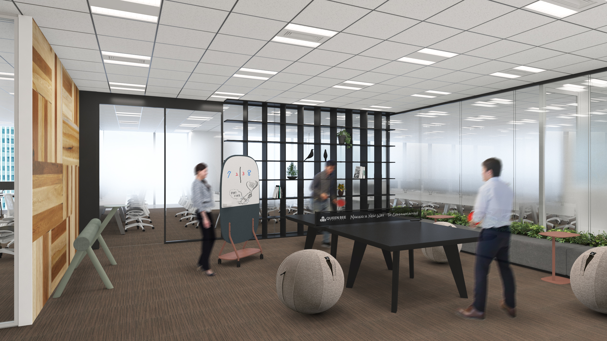 また、このエリアは単にアクティビティやコミュニケーションといったものにとどまらず、何か着想があれば、卓球台は瞬時に打ち合わせテーブルに変えることができ、アイデアを瞬時に共有してのミーティングを可能にしており、継続的な業務改善やアイデア創出を支える環境づくりを目指しました。