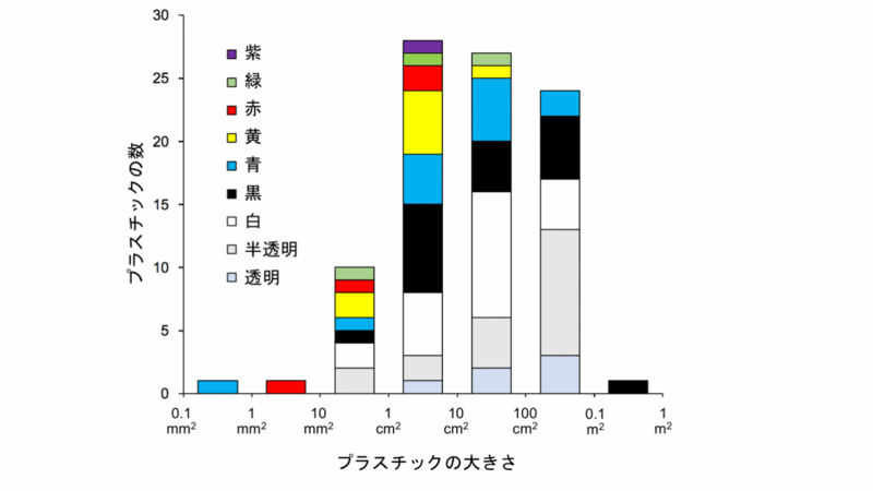 2)プラスチックの大きさは、マクロプラスチックに相当する10cm2-1m2のものが56.5%、メソプラスチックに相当する10mm2-10cm2のサイズが41.3%を占めました。