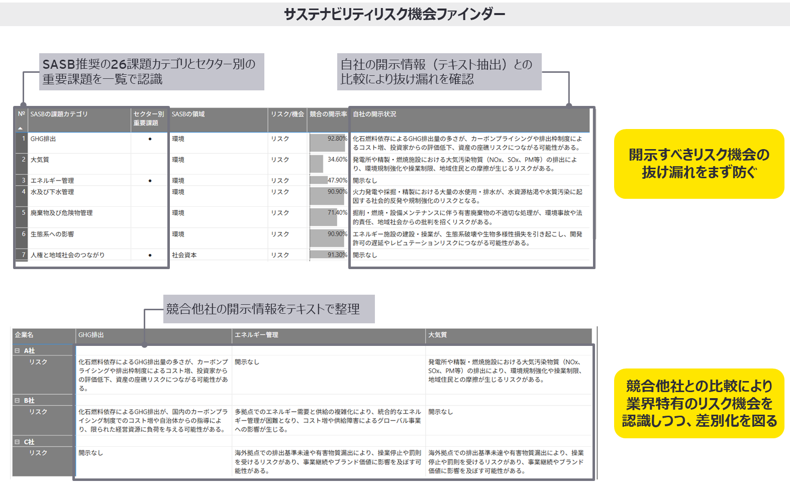 ・クライアントが対応するべきサステナビリティリスク・機会をSASB(サステナビリティ会計基準審議会)など国際的な開示基準に沿って、AIが情報を収集