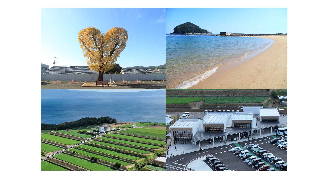 (左上) 全国でも珍しい ハートの銀杏の木 (右上) オートキャンプも出来る 結の浜マリンパーク