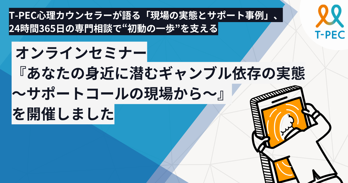 ティーペックが運用する健康・医療情報Webサイト「T-PEC Channel」会員向けに、サポートコールセンターの現場スタッフ(公認心理師、臨床心理士、産業カウンセラー)が登壇するセミナー「あなたの身近に潜むギャンブル依存の実態~サポートコールの現場から~」を開催し、最新の相談傾向や支援の実際を解説しました。