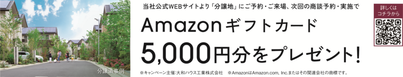 2026年1月5日~3月31日の期間中、大和ハウスの公式WEBサイトから「分譲地」にご予約の上、ご来場いただき、次回のご商談予約・実施いただいた方には「Amazonギフトカード5,000円分」をプレゼント。