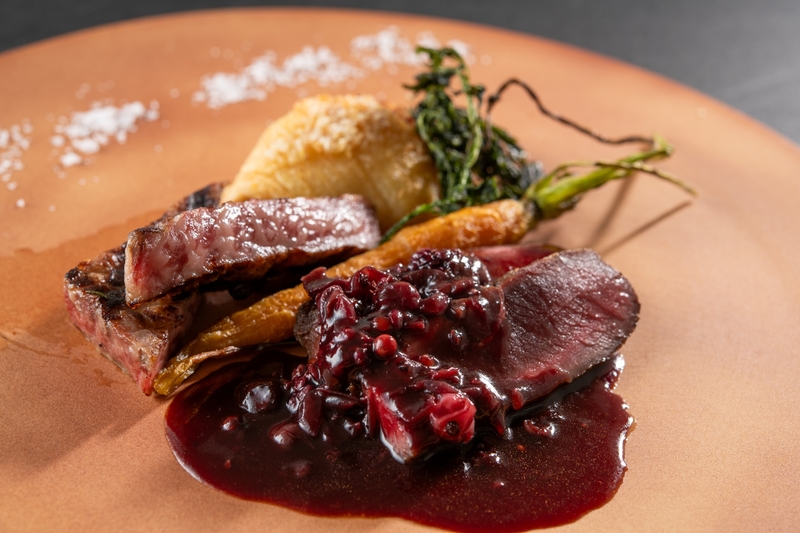 黒毛和牛のポワレ 鹿肉のグリル ベリーの信州赤ワインソース