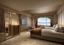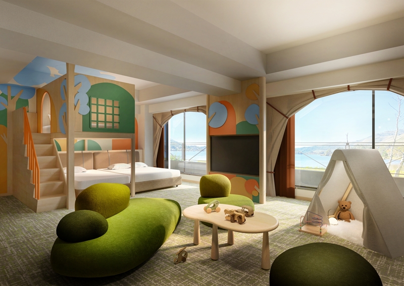 客室は旅のスタイルに合わせて選べる2つの新客室が誕生します。1つ目はデラックスキッズルーム。木調の家具に囲まれたナチュラルな空間に、テントや知育玩具を配した客室は「まるで森の中の隠れ家。知育と遊び心の部屋」。滞在することで好奇心や探求心を刺激し、遊びの中から学びを得られる子育て世代には嬉しい設えでご用意いたしました。2つ目はアースカラーで統一された落ち着きのある空間がスタイリッシュなデラックスツイン。「女神湖畔のテントで過ごすような非日常」をご体験ください。