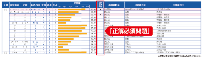 全設問を正答率の高い順(易しい問題順)に並べたときに、現在の得点から判断して正解できるラインだったのに間違えた問題が「正解必須問題」です。間違えた原因が理解不足なのか演習不足なのか等をきちんと分析し、次回は確実な正答を目指しましょう。