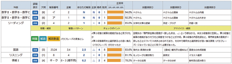 成績表は試験実施後・中4日で返却されるため、受験時の記憶が新しいうちに復習が可能です。志望校の合格可能性や偏差値の表示はもちろん、優先的に対策をすることで大きく得点を伸ばせる「正解必須問題」がわかります。WEB成績表では、「正解必須問題」をなぜ間違えたのか、チェックすべきポイント、具体的なアドバイスまで提示。実力講師陣によるわかりやすい合格指導解説授業も活用すれば、スピーディーに弱点克服が可能です。