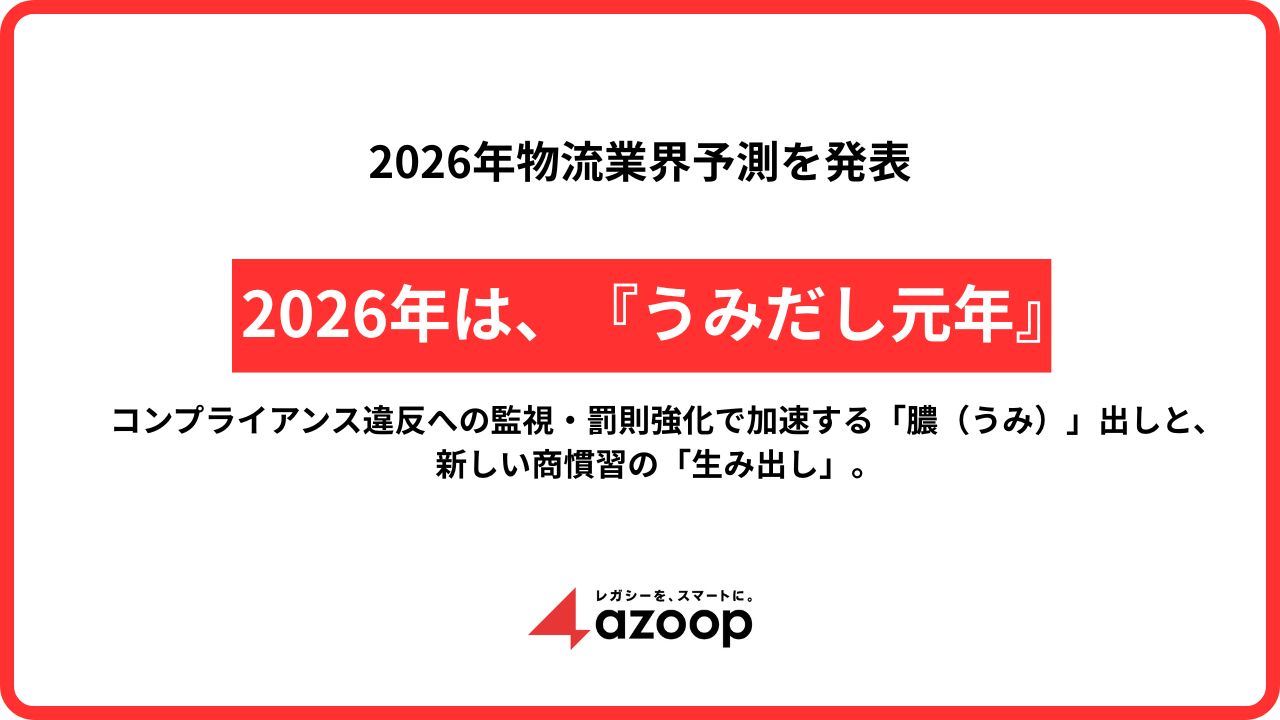 Azoopは、2026年を物流『うみだし元年』と定義しました。 法的な強制力を伴って業界の「膿(うみ)を出す」プロセスと、経営レベルでの改革により新しい物流と商慣習を「生み出す」プロセスが同時に進行する、かつてない激動の1年となると予測しています。