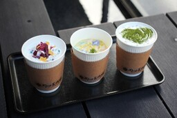 美術館併設の足湯カフェでは、少女革命計画をイメージしたオリジナルドリンクをご提供します。100%源泉かけ流し(加水・加温なし)の足湯を楽しみながら、お召し上がりください。特典として、手書きメッセージつきの特製コースターを、プレゼントいたします。