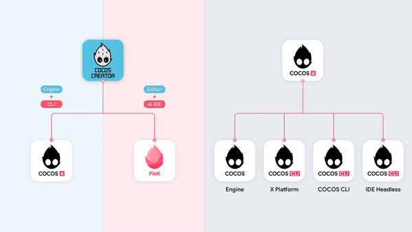 COCOS はエンジンのみを指す名称となり、メジャーバージョンは COCOS 4 へと更新されます。クロスプラットフォームコンポーネントおよびエディターのコア機能は CLI ツールへと変換され、エンジンのコア機能として統合されます。これは今回のオープンソース化における大きな追加要素です。