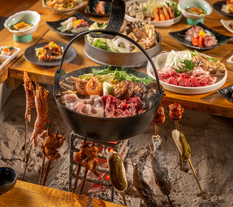 ズワイガニは、目の前で焼き上げる炭火焼に加え、具材を選んで仕上げるオリジナルのカニ鍋、旨みを閉じ込めた炊き込みご飯として提供します。お席で炭火を使い、串焼きや鍋を自ら仕上げる体験を通じて、里山ならではの食文化を五感でお楽しみいただけます。
