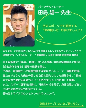 「すべての運動に必要なカラダの使い方‐軸を作る」をテーマに、 実際にトレーニングを行いながら、カラダの使い方を学べる内容となっています。