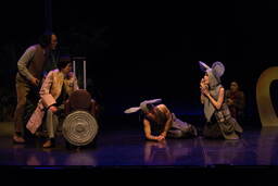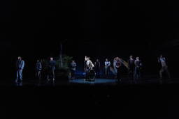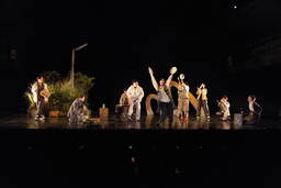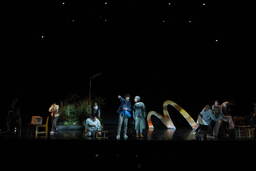 成井が「いつでもどこでも上演可能な芝居」をコンセプトに作ったという言葉の通り、西本の演出においても大掛かりなセットはなく、役者たちの芝居と小道具によって観るものの想像を膨らませるような作りだ。
