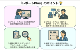 「レポートPlus」は、アルコールチェックの法令遵守、監査対応の徹底をサポートする有償オプションサービスです。