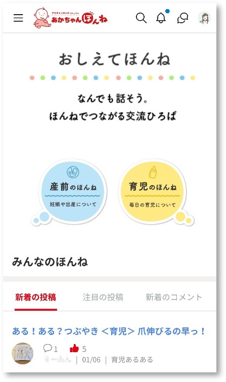 アカチャンホンポが運営するコミュニティサイト『あかちゃんほんね』は、「赤ちゃんのいる暮らし」を起点に、妊娠・出産・育児の喜びや不安を分かち合い、みんなで支え合うための場所です。