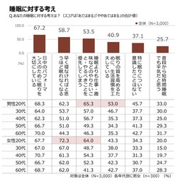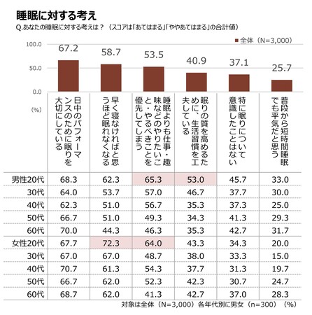 さらに、約半数が「睡眠よりも仕事・趣味などのやりたいこと・やるべきことを優先してしまう」(53.5%)としており、男女とも20代(男性65.3%、女性64.0%)が最も高くなっています。