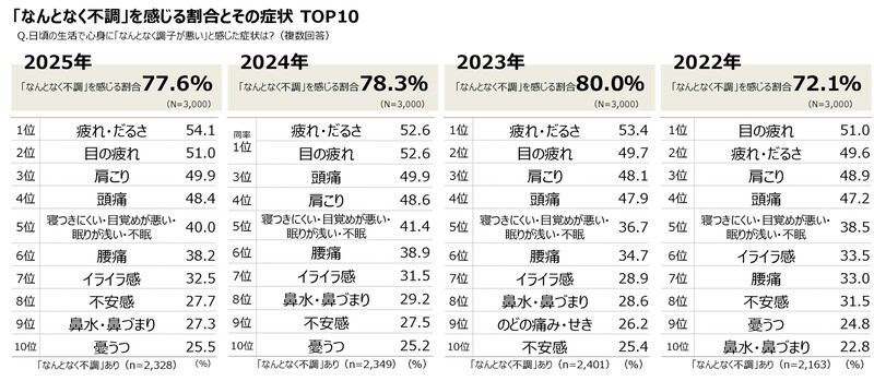 2025年約8割が感じた「なんとなく不調」 症状TOP3は「疲れ・だるさ」「目の疲れ」「肩こり」