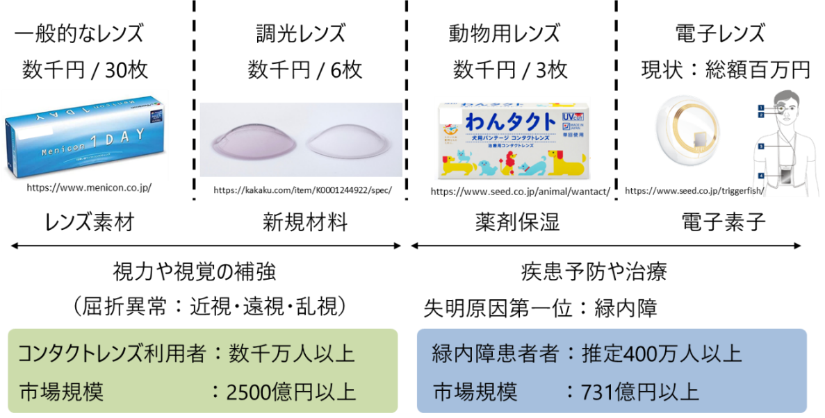 コンタクトレンズは、屈折異常を矯正して視力を補強するウェアラブルな高度医療機器としての利用が一般的ですが、近年、これらのレンズと電子デバイスを組み合わせることで「視る」から「診る」を実現可能なスマートコンタクトレンズの開発が盛んです。とりわけ、国内失明原因の第1位である緑内障を検出する医療機器の開発は、疾患予防や遠隔在宅診療を実現する点で「健康寿命の延伸」や「医療費削減」への期待が高まっています。さらに、緑内障の患者数*1は、400万人以上(40歳以上の5%、70歳以上の10%)に達しており、その開発は急務と言えます。