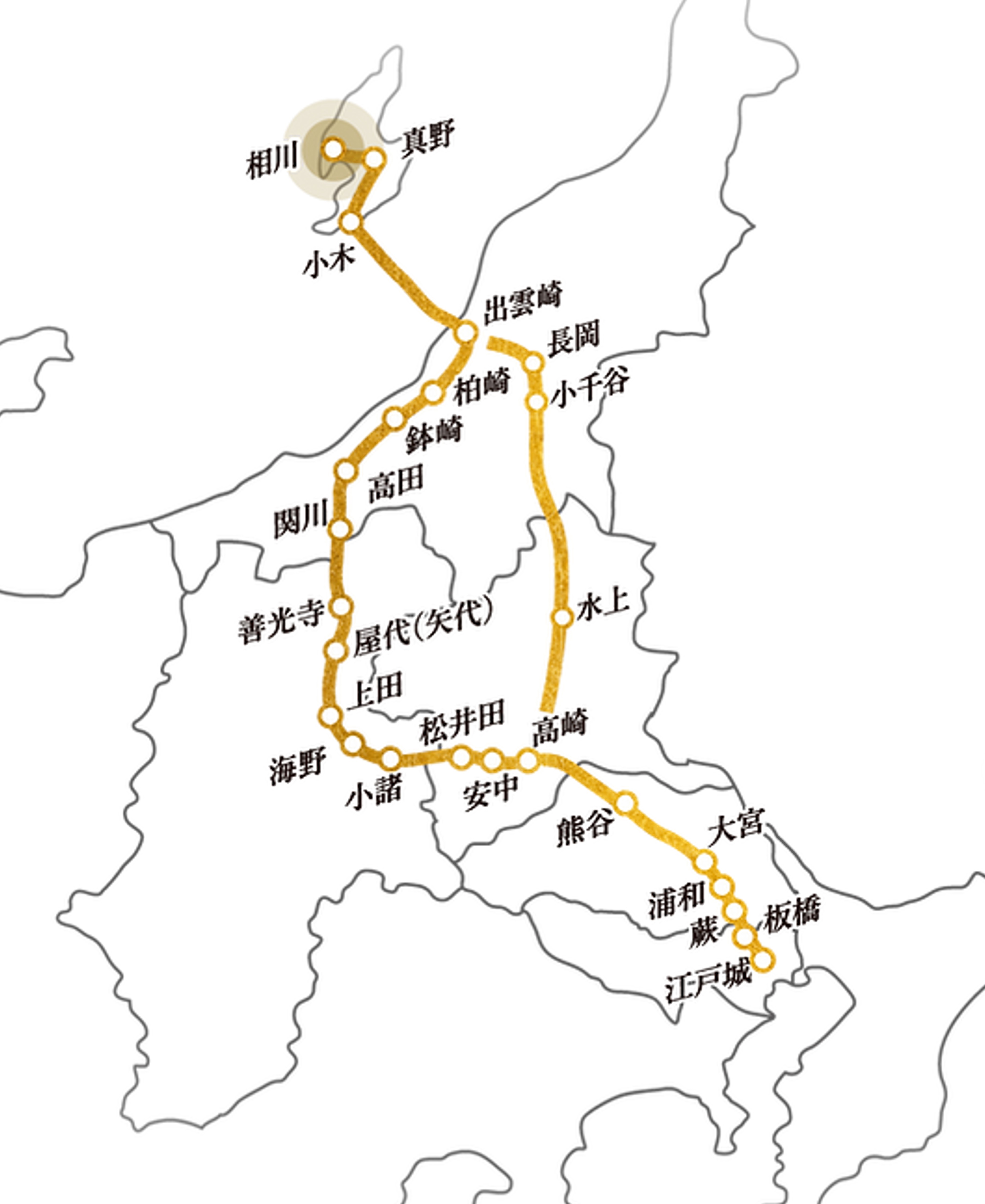 「金の道」とは江戸時代に佐渡で産出された金銀を江戸まで運んだルートです。現在の新潟県佐渡市相川地区から―小木地区、そして海路を挟み、新潟県出雲崎港に陸揚げされてからは主要ルートである北国街道、追分宿(現在の軽井沢)から中山道を経て最終地江戸日本橋までを結んだ道が「金の道」です。