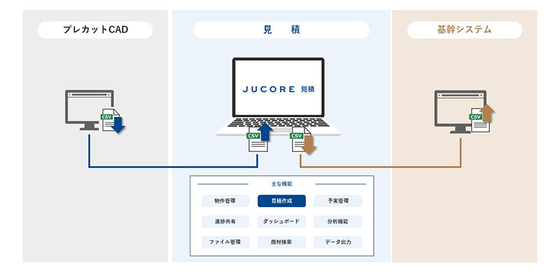 JUCORE 見積にはCSV出力機能も標準搭載していますので、現在利用中の自社の基幹システムとのデータ連携も実現可能です。