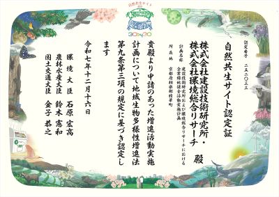 株式会社建設技術研究所(本社:東京都中央区、代表取締役社長:西村 達也)とCTIグループの株式会社環境総合リサーチ(本社:京都府相楽郡精華町、代表取締役社長:西山 勝栄)は、環境総合リサーチ社屋のある「ER&Sけいはんなの共生草地」について、環境省が定める「自然共生サイト」に認定され、2026年1月13日に執り行われた令和7年度第2回自然共生サイト認定式において、認定証を受理しました。
