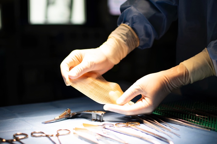 心・血管修復パッチ「シンフォリウム」は、先天性心疾患の手術で使用される医療機器です。吸収性の糸と非吸収性の糸で編んだ特殊な構造のニットに、吸収性の架橋ゼラチン膜を一体化させています。手術によって心臓や血管に縫着された後、まず架橋ゼラチン膜が、次に吸収性の糸が徐々に分解され、その間に非吸収性の糸を含むように自己の組織が形成されます。これにより、先天性心疾患の外科手術後に生じる材料の劣化や、成長に伴うサイズのミスマッチといった課題の解決が期待されています。