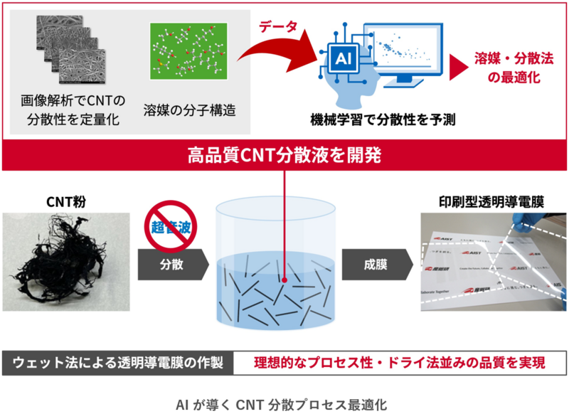 産総研ではこれまでに、分散剤を添加することで高導電性塗布膜の性能向上を実現するなど、工業プロセスに適したウェット法の改良に取り組んできました(産総研プレス発表2019年1月11日)。一方で、CNT応用研究の過程で明らかになった課題として、従来のウェット法は、超音波処理によるCNT品質の劣化や、利用可能な溶媒が限られることによって、印刷法などの多様な成膜プロセスに対応しにくいことが挙げられ、実用化を阻害する要因となっていました。このため、今回はCNTの分散性とそのメカニズムに着目し、AIを活用して溶媒や分散条件を合理的に最適化する手法の開発に取り組みました。