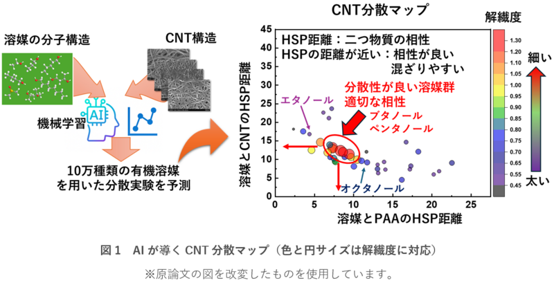 ・ 機械学習を活用して、液中のCNTの分散に最適な溶媒を選定し、超音波処理に頼らない高品質CNT分散液を得る手法を開発