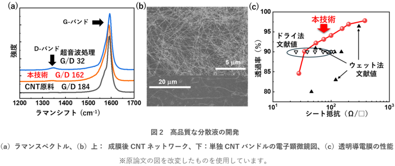 分散性の高い溶媒は、CNTバンドルをほぐしやすく、分散に必要なエネルギーを小さくすることができます。従来は細かく分散するために強力な超音波処理が用いられてきましたが、本研究では、図1に示すように分散性の高い2-ブタノールを用いて、比較的マイルドな条件で超音波処理を用いずにCNTを分散する手法を検討しました。CNT分散液中のCNTの品質評価にはラマンスペクトルを用いました。ラマンスペクトル測定では、結晶性に由来するGバンドと欠陥に由来するDバンドが観察され、G/D比によりCNTの結晶性を簡便に評価できます。本研究で開発した、高速攪拌のみで作製したCNT分散液のラマンスペクトル測定では、図2(a)に示すように、原料CNTとほぼ同様に、Dバンドが非常に弱く、G/D比は160を超える高い結晶性を示しました。これは、分散プロセスによって欠陥がほとんど生じていないことを意味します。図2(b)で示した電子顕微鏡観察からも、CNTが20 µm以上の長さを維持したまま均一に細かく分散されていることが分かりました。さらに、得られたCNT分散液を用いて透明導電膜を作製し、その光学特性と電気特性を評価しました。図2(c)に示すように、作製した透明導電膜は、波長500 nmにおける光透過率90%でシート抵抗35 Ω/sq.という高い導電性を示しました。これは、従来のウェット法で得られる成膜性能を上回り、ドライ法で作製した膜にも匹敵する性能です。