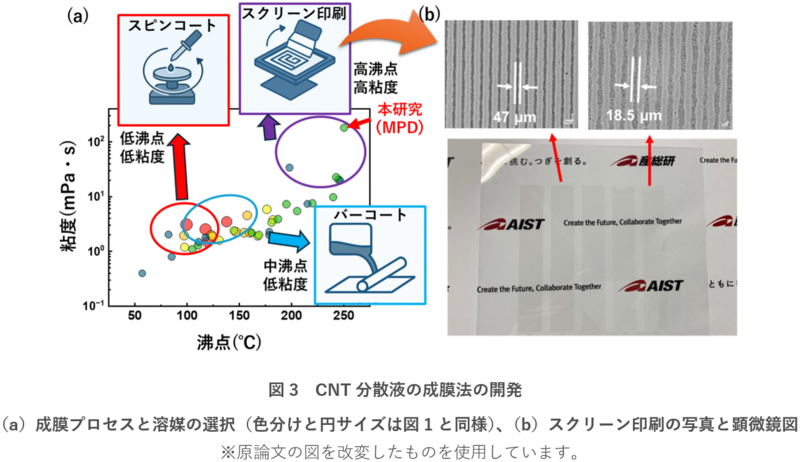 ウェット法の最大の利点は、印刷を含む多様な成膜プロセスに適用できる点です。本研究では、図3(a)に示すように、図1で構築した分散マップを基に解繊度が0.8以上を示す溶媒の沸点と粘度を整理しました。これにより、多様な成膜技術に適用できるCNT分散液の設計が可能となり、用途の拡大につながります。例えば、スピンコートでは、急速な乾燥と均一な膜形成を実現するため、約100 ℃付近の沸点で低粘度の溶媒が適しています。バーコートでは、大面積塗布の安定性を保つために、100〜150 ℃程度のやや高い沸点と低粘度が望まれます。一方、スクリーン印刷やブレードコートでは、インクの安定性とパターンの精度を保つため、より高い沸点と高い粘度の溶媒が必要となります。このように、解繊度の高い溶媒についてその沸点や粘度を可視化することで、分散性を維持しつつ、成膜プロセスに応じた最適な溶媒を選択することが容易になりました。例えば、高解像度のスクリーン印刷を行うために、本研究では3-メチル-1,5-ペンタンジオール(MPD)を溶媒として選択しました。この溶媒は、高い粘度(20 ℃で181 mPa·s)と約250 ℃という高い沸点を有しており、スクリーン印刷に適した特性を備えています。その結果、図3(b)に示すように、18.5 µmという極細CNTラインのスクリーン印刷に成功し、世界最高性能の印刷型CNT透明導電膜を実現しました。