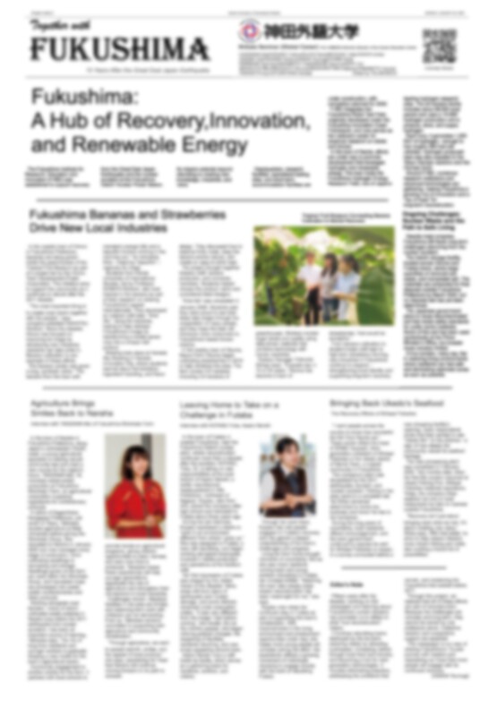| 神田外語グループ(東京都千代田区/理事長:佐野元泰)は、東日本大震災・原子力災害から15年の節目にあたり、福島の復興と学生の学びを世界に発信する「震災復興発信プロジェクト」を展開しています。その一環として、グローバル人材の育成を目指す神田外語大学・柴田真一ゼミの学生19名が、福島県浜通り地域での取材をもとに、日英版の震災復興新聞『福島とともに(英題:”Together with Fukushima”)』を完成させました。このたび完成した本紙を、2026年1月26日(月)に福島県へ贈呈する予定です。あわせて、同プロジェクトの成果物の一つとして制作した震災復興ビールも贈呈します。本贈呈式は、学生による取材と学びの成果を、震災復興新聞を通じて福島県へ届ける機会として実施します。 |