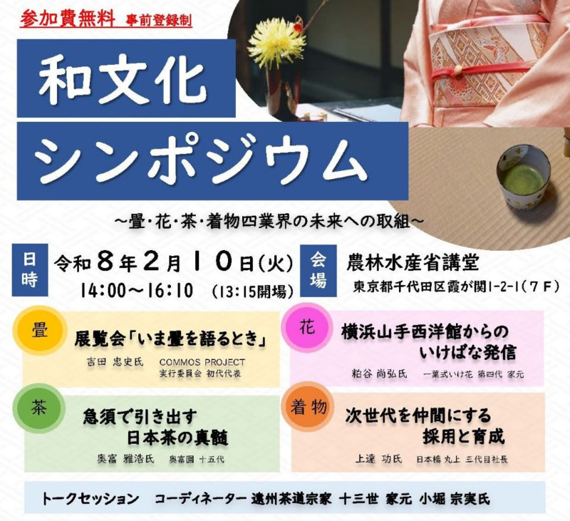 | 〇 令和8年2月10日(火曜日)、和文化を支える畳・着物・茶・花の各業界による未来への取組を紹介するシンポジウムを開催(事前申込制・参加無料)。 〇 申込みは令和8年2月2日(月曜日)まで。申込フォームから参加登録。 〇 和文化に関心のある方や業界関係者の参加を歓迎。 |