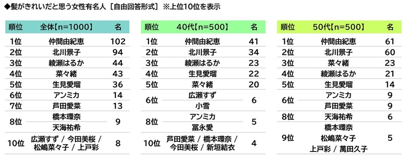 回答者の年代別にみると、40代回答者では1位「北川景子さん」(29名)、2位「綾瀬はるかさん」(16名)、3位「内田有紀さん」(7名)、50代回答者では1位「北川景子さん」(31名)、2位「吉瀬美智子さん」(19名)、3位「石田ゆり子さん」(13名)となりました。