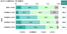 年代別にみると、『ある(計)』と回答した人の割合は年代が上がるにつれ高くなる傾向がみられ、最も高くなった50代後半では96.4%でした。一方、最も低くなった40代前半でも80.4%が『ある(計)』と回答しました。