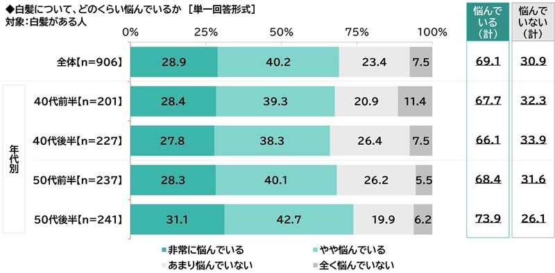 「白髪に悩んでいる」白髪がある人の69%、50代後半では74%