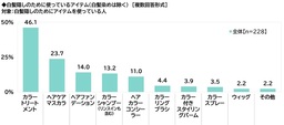 白髪隠しのためにアイテム(白髪染めは除く)を使っている人(228名)に、どのようなアイテムを使っているか聞いたところ、「カラートリートメント」(46.1%)が最も高くなりました。普段のトリートメントをカラートリートメントに替えるだけで手軽に染められるため、活用している人が多いのではないでしょうか。次いで高くなったのは、「ヘアケアマスカラ」(23.7%)、「ヘアファンデーション」(14.0%)、「カラーシャンプー(リンスインも含む)」(13.2%)、「ヘアカラーコンシーラー」(11.0%)でした。