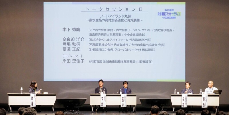 トークセッションでは、「新生シリコンアイランド九州~広域リージョン連携による産業クラスター形成~」及び 「フードアイランド九州~農水産品の高付加価値化と海外展開~」をテーマに、九州・沖縄の各県で主体的かつ積極的に地方創生に取り組む皆様から、広域的な戦略的産業クラスターの力強い取組や農水産物を中心とした地場産業の高付加価値化、販路開拓の取組等について幅広くご紹介いただくとともに、地域の持つ活力や伸び代をもとにした強い地方経済の創出などについて議論を深めました。
