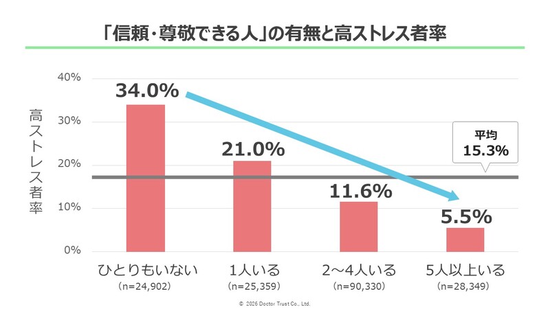 また、信頼・尊敬できる人が「いる」グループと「いない」グループでは、高ストレス者率に最大13ポイントの差が見られ、信頼できる人が多いほど高ストレス者率は低下する傾向が明らかになりました。