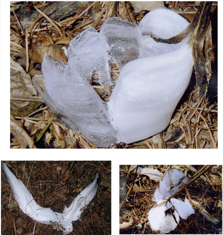 エゴマ・シモバシラ等の植物は茎が枯れた後も根が生きており、土壌から吸収した水を枯れた茎に送り続けます。その水分が冬の寒さで少しずつ凍った結果、荒倉山の「氷の華」ができあがります。