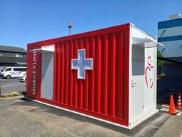 1. 医療用コンテナ「モバイルクリニック」 陰圧設備や空調を完備し、感染症対策に対応した個室空間です。発災直後の救護所としてはもちろん、プライバシーが守られた健康相談室としても機能します。
