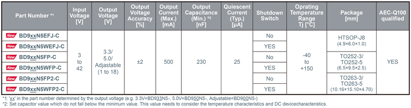 ローム株式会社(本社:京都市)は、車載機器、産業機器、通信インフラなどに用いられる12V/24V系プライマリ(※1)電源用途向けに、独自の超安定制御技術「Nano Cap™(ナノキャップ)」 を搭載した出力電流500mAのLDOレギュレータ(※2)IC「BD9xxN5シリーズ」全18製品を開発しました。